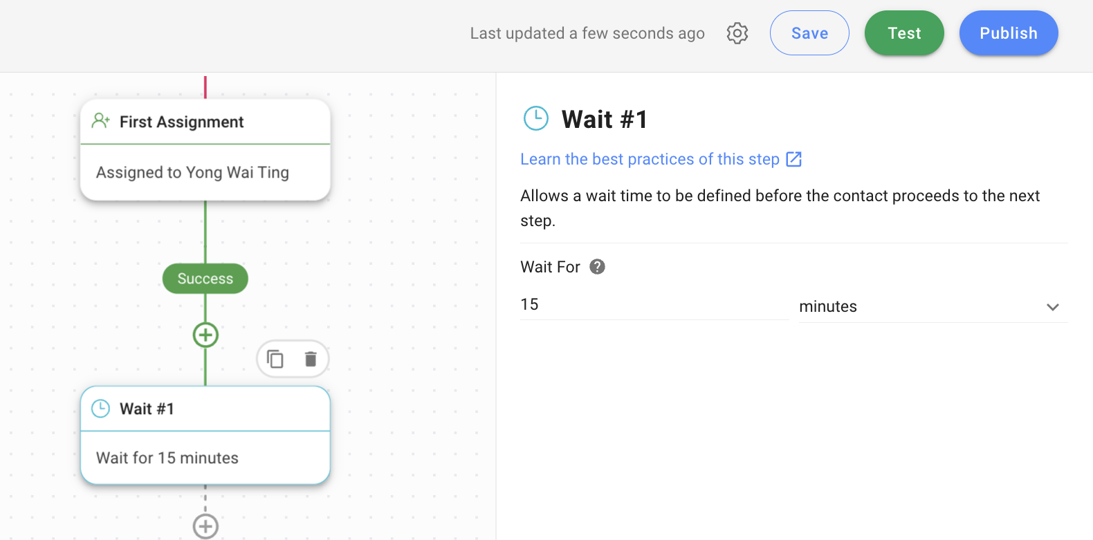 然后,添加一个等待步骤。 如果初始代理在指定时间内未响应,您可以设置对话重新指派给另一代理的持续时间。 在此示例中,持续时间设置为15分钟