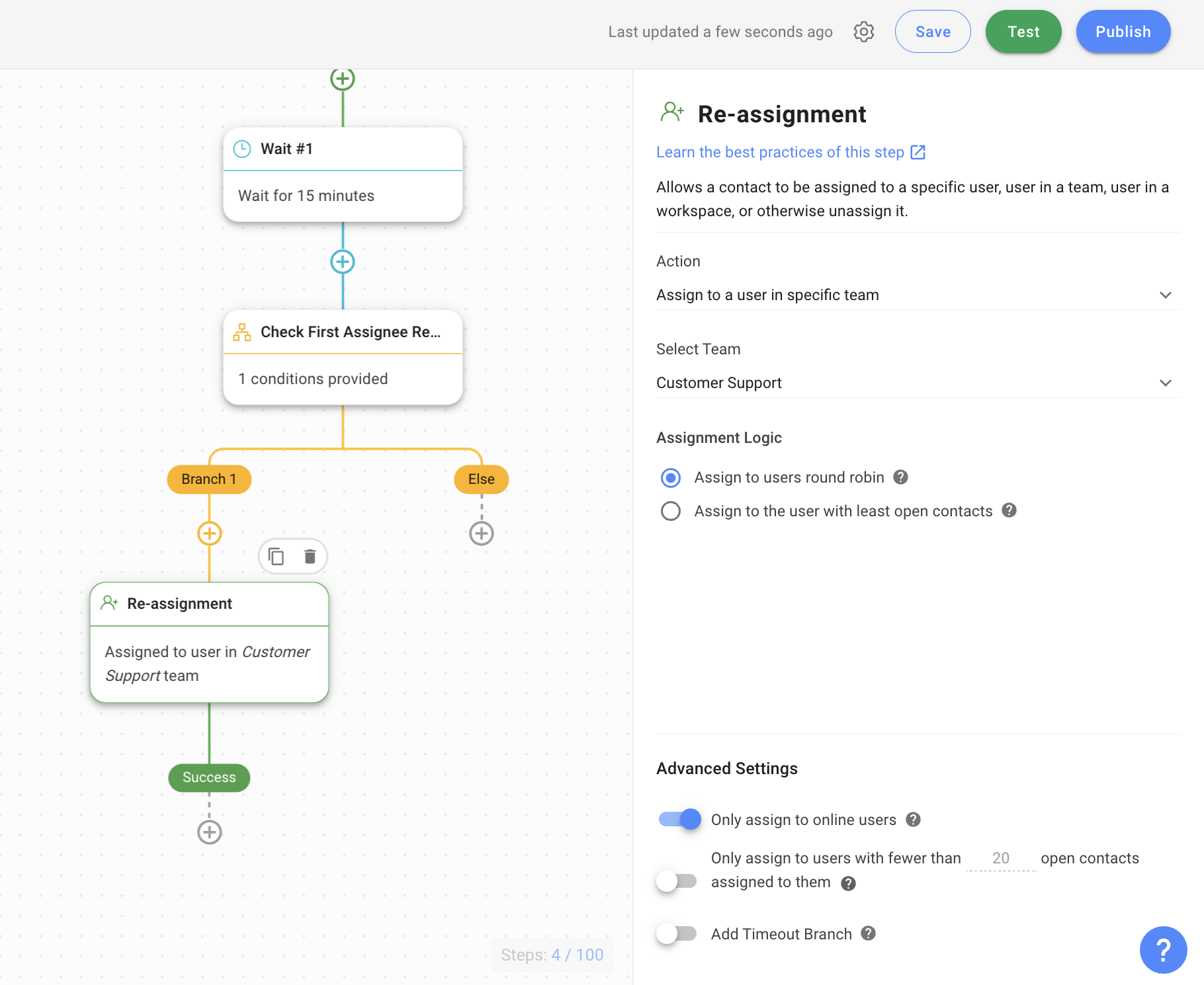 5. 如果满足条件,则添加一个分配给步骤,根据您的业务需求将对话重新分配给另一个团队或特定代理。 在此示例中,工作流配置为将对话分配给特定团队中的代理。